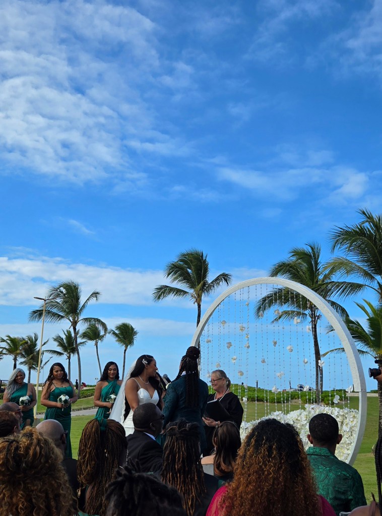 This was the day of the wedding, so we were up early for our appointments at Posh Beauty Bar to get our hair and makeup done. I showed example pictures to my stylist, Rosa, and she did an amazing job recreating the look I wanted! We met the bride in her suite to get ready and then we all headed down to the Ipanema Garden. This was one of the outdoor wedding locations that wasn’t directly on the beach, and it was beautiful!
